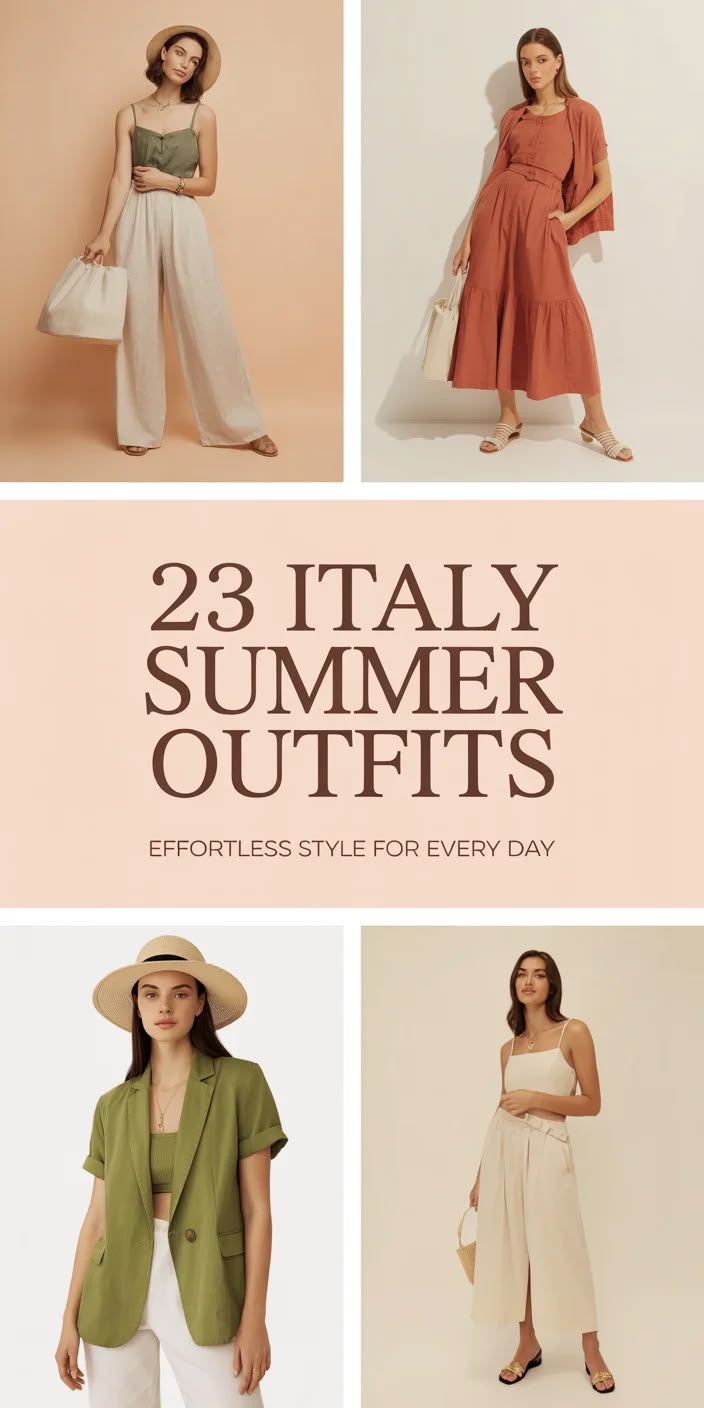 Italy summer style starts with breathable fabrics, and nothing feels more luxurious than linen. Think relaxed linen shirts paired with high-waisted shorts or flowy trousers in neutral tones. These outfits ideas are perfect for strolling along coastal towns like Amalfi, giving you that effortless European elegance. Soft beige, ivory, and muted pastels dominate this aesthetic, making your look timeless and Instagram-worthy. Add simple sandals and a woven tote for a polished finish. These outfits are not just stylish but also practical for the heat, making them a must-have in your 2026 wardrobe.