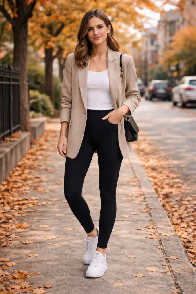 Oversized blazers are trending in modern fall outfits ideas because they create a relaxed yet fashionable silhouette. Pair a slightly oversized blazer with black leggings and a fitted top to keep the look balanced and stylish. Sneakers or chunky boots add a street-style edge that feels both comfortable and trendy. This outfit works perfectly for running errands, casual meetups, or travel days during cooler fall weather