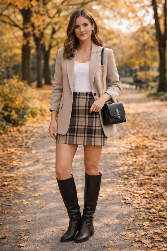 A blazer styled with a mini skirt creates a playful yet polished fall outfit idea. This combination blends structure with femininity, making it perfect for brunch, casual office settings, or weekend outings. A plaid mini skirt paired with a tailored blazer instantly gives off a fall-inspired vibe. Add knee-high boots and a small shoulder bag for a chic layered look that feels fashionable and seasonal