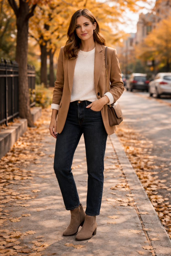 Layering a blazer over a lightweight sweater is one of the coziest fall outfits ideas for transitional weather. This pairing keeps you warm while maintaining a polished and sophisticated look. Choose soft knit textures in neutral tones like cream, taupe, or soft gray. Pair with tailored trousers or dark denim for an elegant everyday outfit perfect for work or casual meetings.