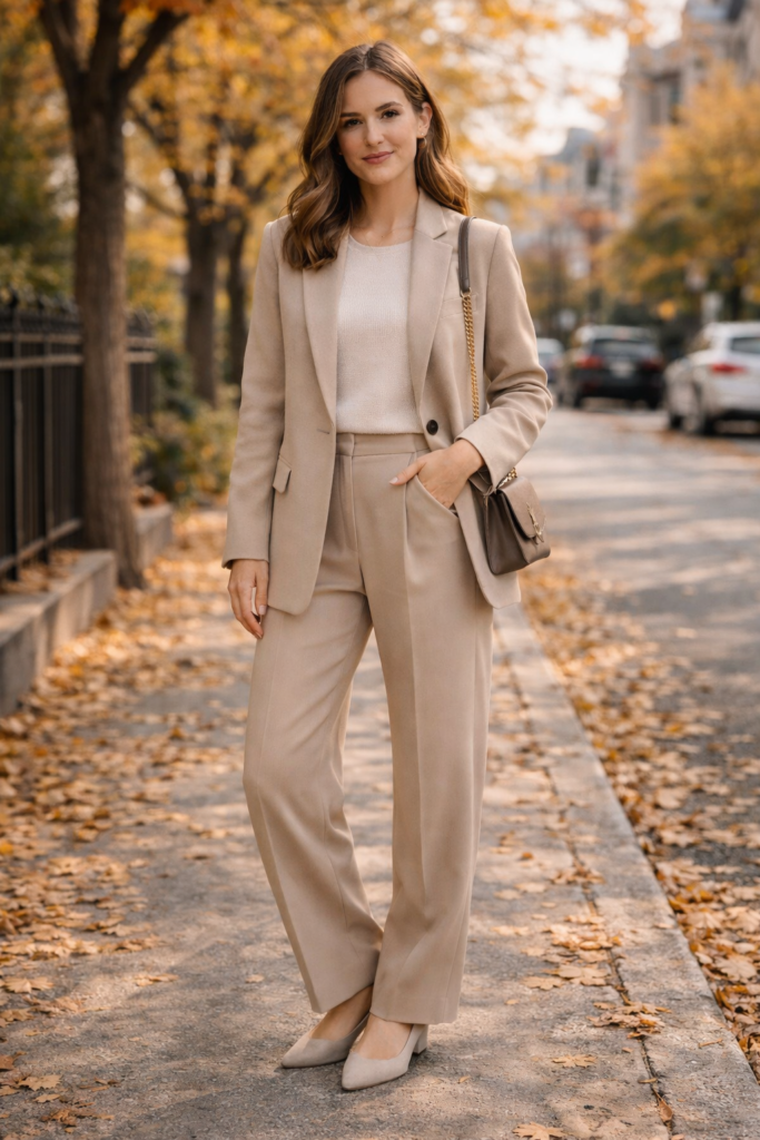 Monochrome styling is one of the most popular fall outfits ideas in modern fashion. Choose a single color palette like all-beige, all-gray, or soft brown for a cohesive and elegant look. A matching blazer and trousers set layered over a simple top creates a polished outfit that feels sophisticated yet effortless. Neutral accessories complete the modern minimalist aesthetic perfectly