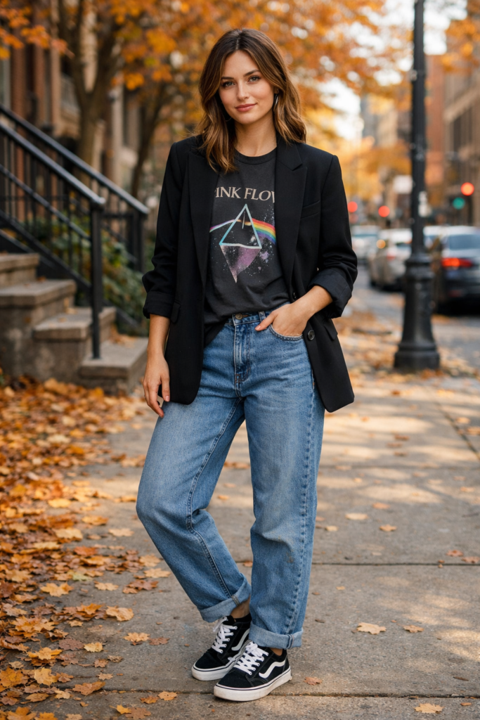 A blazer layered over a graphic tee creates a cool and youthful fall outfit idea. This look mixes casual and polished elements for a trendy street-style vibe. Pair with relaxed jeans and sneakers to keep the outfit comfortable while still looking stylish. This combination works well for casual outings, shopping days, or creative workspaces where fashion expression is encouraged.