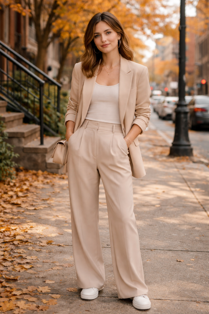 For a more refined style, pair a structured blazer with wide-leg trousers. This elegant fall outfit idea creates a modern silhouette that looks stylish and comfortable at the same time. Neutral tones such as brown, beige, or charcoal are perfect for autumn wardrobes. Complete the look with pointed flats or heeled boots to create a sophisticated outfit suitable for office days or evening dinners.