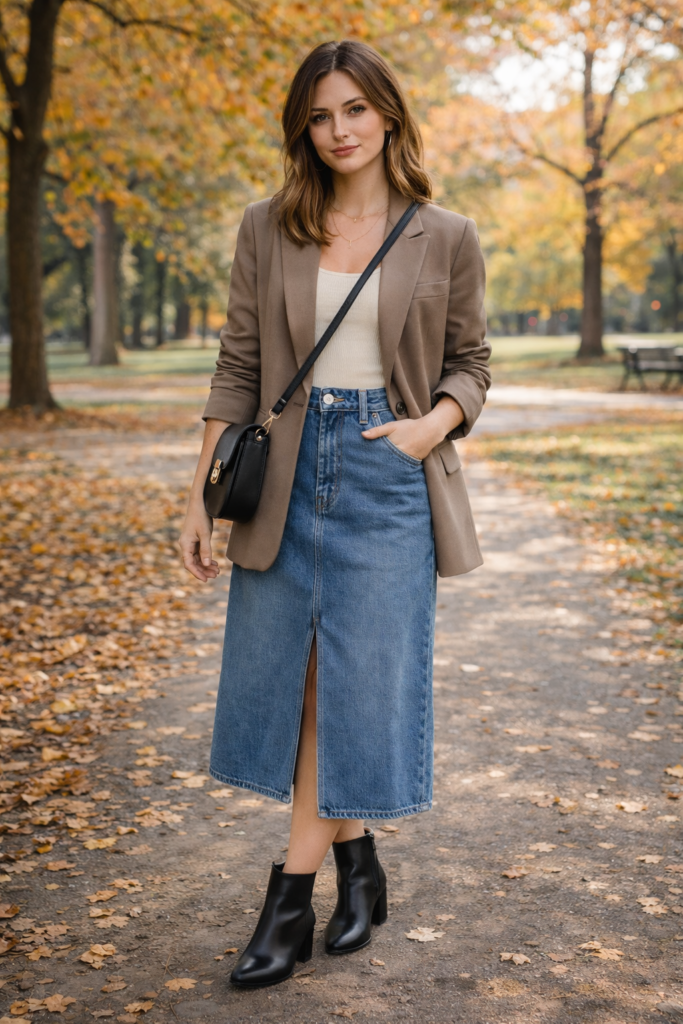 A denim skirt paired with a blazer is a stylish fall outfit idea that blends casual and chic elements. This outfit is great for early fall days when the weather is mild but layering is still needed. Choose a slightly fitted blazer and a mid-length denim skirt for a balanced silhouette. Pair with ankle boots and a crossbody bag for a comfortable yet trendy everyday outfit.