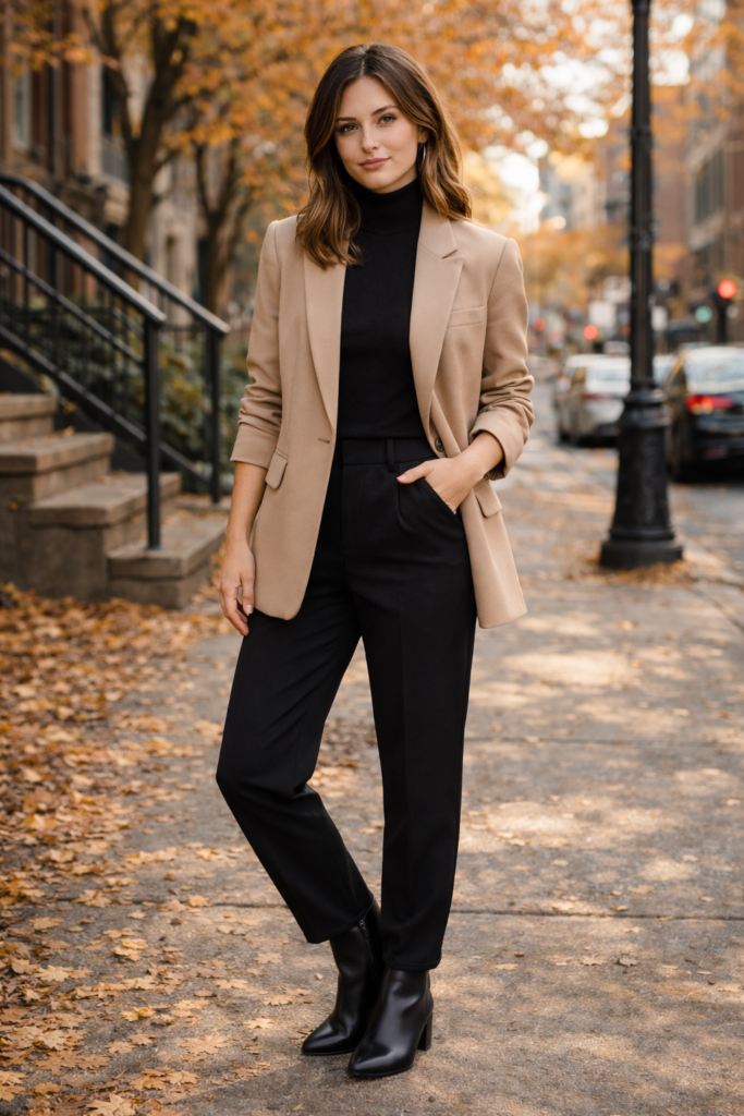 The blazer and turtleneck combination is a classic fall outfit idea that feels both warm and refined. A slim turtleneck layered under a structured blazer creates a sleek silhouette perfect for cooler days. Pair with tailored pants or dark denim for a timeless look suitable for work or evening outings. This outfit always feels polished and seasonally appropriate