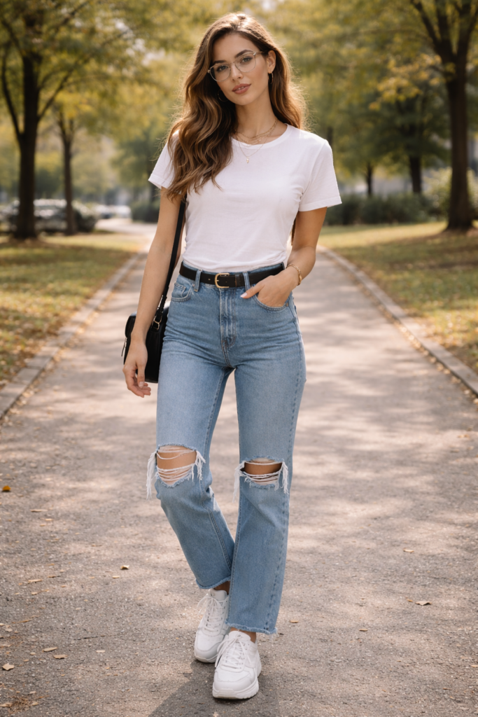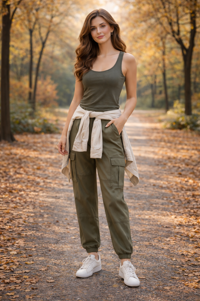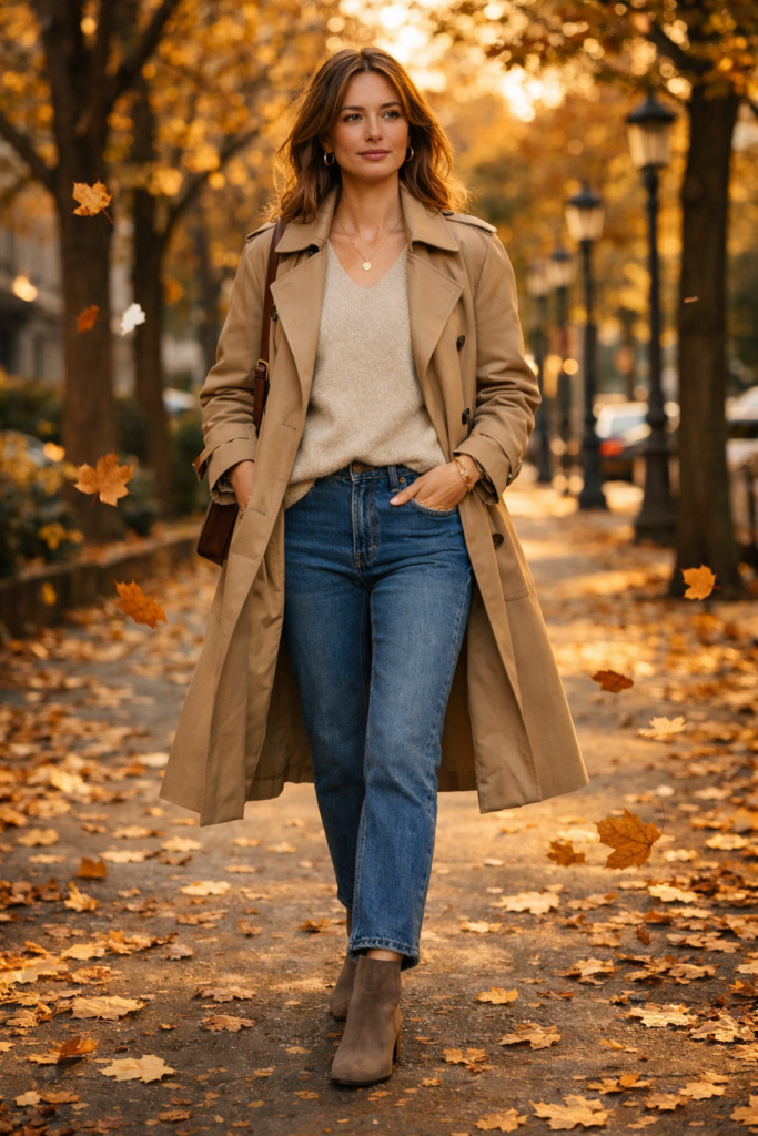 A classic trench coat outfit is one of the most timeless fall outfit ideas for 2025. Pair a neutral beige trench coat with straight-leg jeans, ankle boots, and a lightweight knit sweater. This outfit works perfectly for casual days, office wear, or weekend outings. Trench coats remain a staple in stylish fall outfits because they provide warmth without feeling bulky. Add a structured handbag and simple gold jewelry for a polished seasonal wardrobe look.
