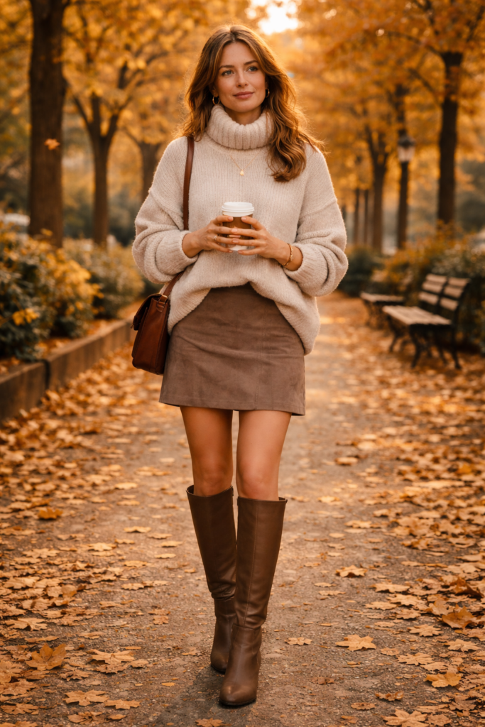 Oversized sweaters continue to dominate fall outfits trends in 2025. Pair a chunky knit sweater with a mini skirt or skinny jeans and finish the look with knee-high boots. This combination balances comfort and style while creating a cozy autumn aesthetic. Neutral tones like beige, cream, and soft brown are trending colors that easily match with different wardrobe pieces.