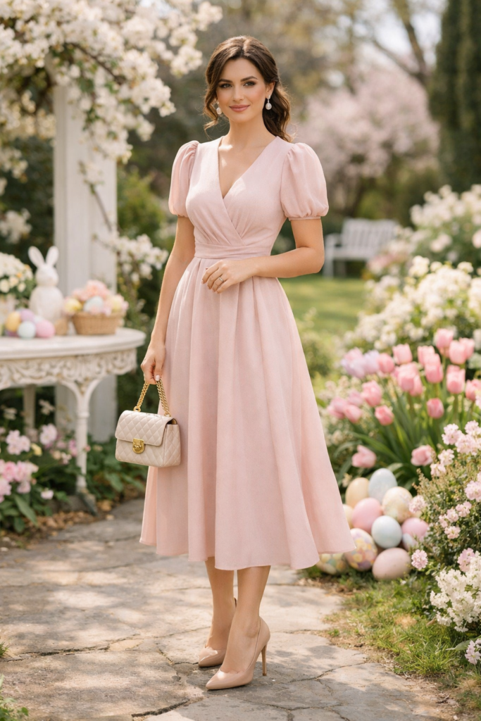 A soft pink dress is one of the prettiest choices for Easter because it instantly creates a sweet and polished spring mood. For 2026, styling it with a statement bow, pearl headband, or elegant hair accessory adds a trendy and youthful touch without making the look feel overdone. Keep the rest of the outfit simple with neutral heels and a small handbag so the details remain the focus. This is a charming outfit idea for brunch, church, and Easter photos.