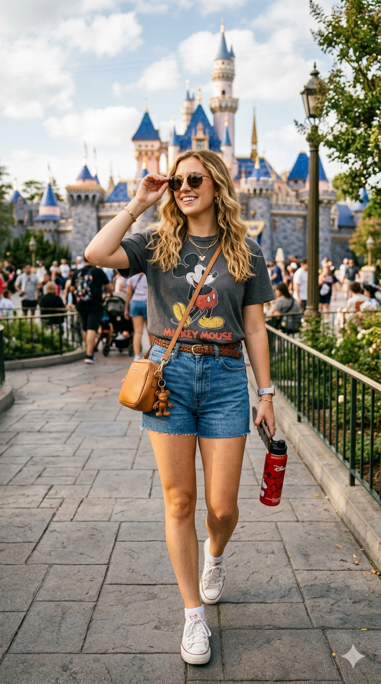 For a casual yet trendy look, pair a classic Mickey Mouse graphic tee with high-waisted denim shorts. This combination is ideal for staying cool and comfortable throughout the day. You can elevate the outfit with a crossbody bag and stylish sunglasses. It’s one of the easiest Disney outfits ideas that still feels fashionable and effortless. Opt for soft, breathable fabrics to beat the heat while keeping your look fresh and modern.