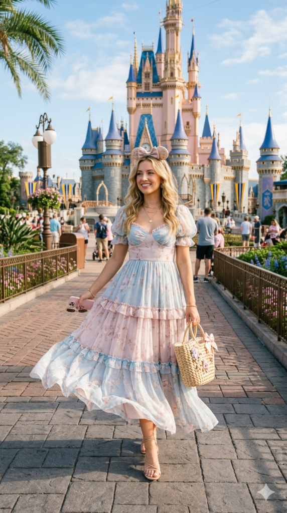 Channel soft elegance with a princess-inspired outfit featuring a flowy pastel dress. Shades like lavender, blush pink, or baby blue bring a dreamy Disney vibe perfect for castle photos. Pair the dress with strappy sandals and delicate jewelry for a graceful finish. This outfit is ideal for those who want to feel magical while staying cool in the summer heat