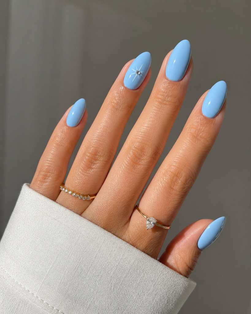 If you prefer soft aesthetics, baby blue minimalist nails are a must-try. Tiny stars, dots, or line art on a pastel blue base keep things cute and modern. This manicure pairs perfectly with cozy neutral outfits.