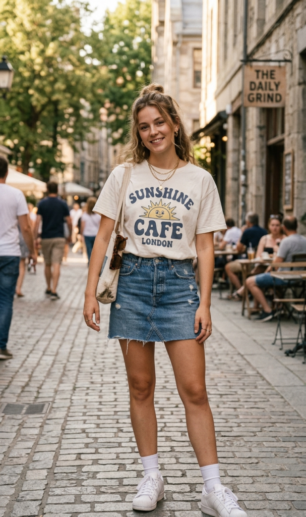 A graphic t-shirt paired with a denim skirt creates a playful and youthful outfit. It’s perfect for casual days when you still want to look trendy.