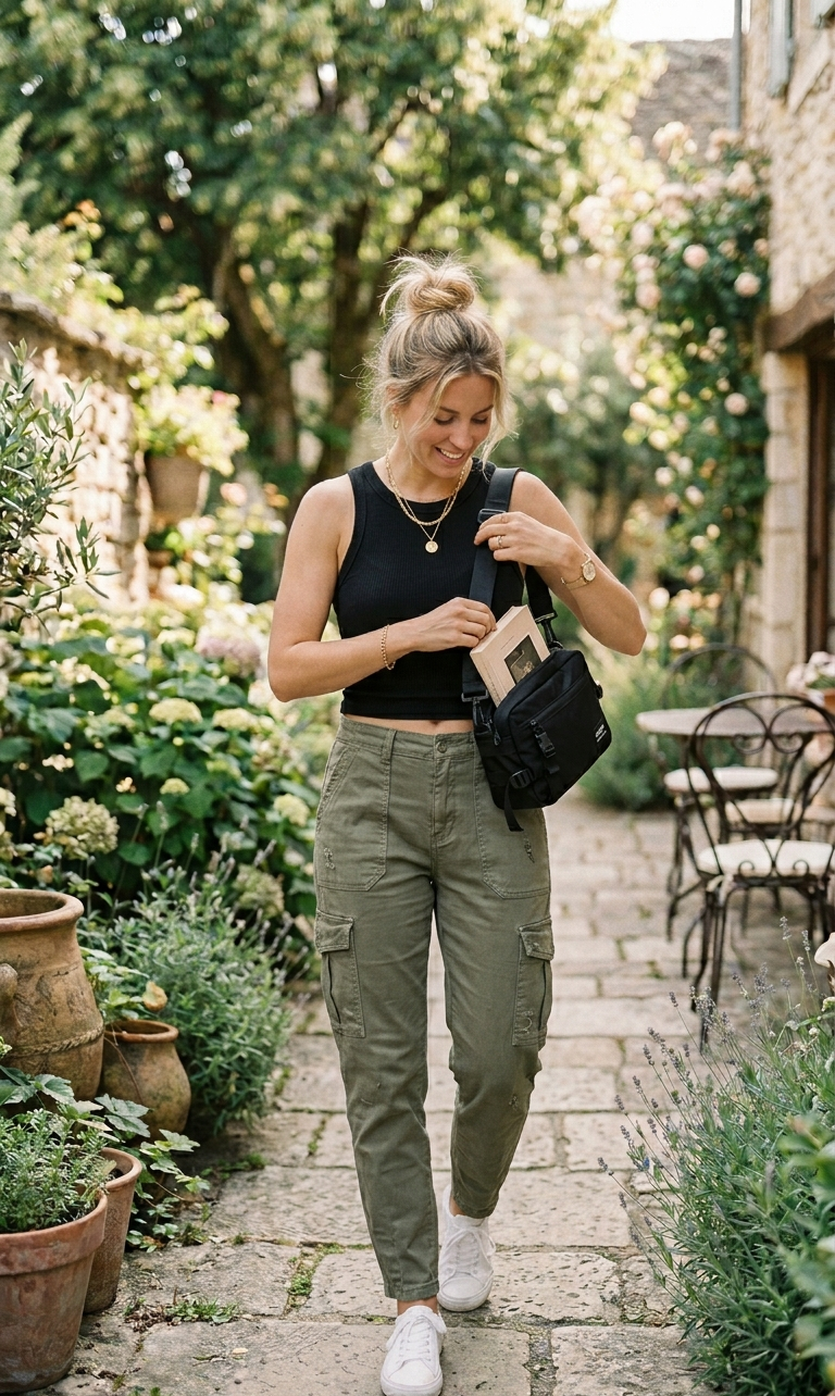 For an edgy yet casual vibe, pair a fitted tank top with cargo pants. This outfit balances comfort and street-style fashion, making it perfect for everyday wear.