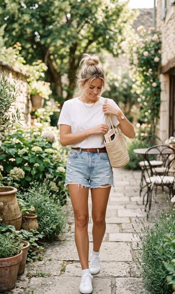 1. Classic White Tee & Denim Shorts