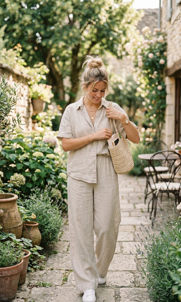 Linen is a summer essential. A loose linen shirt with wide-leg pants creates a breathable and elegant outfit. Neutral tones keep it sophisticated and effortlessly chic.