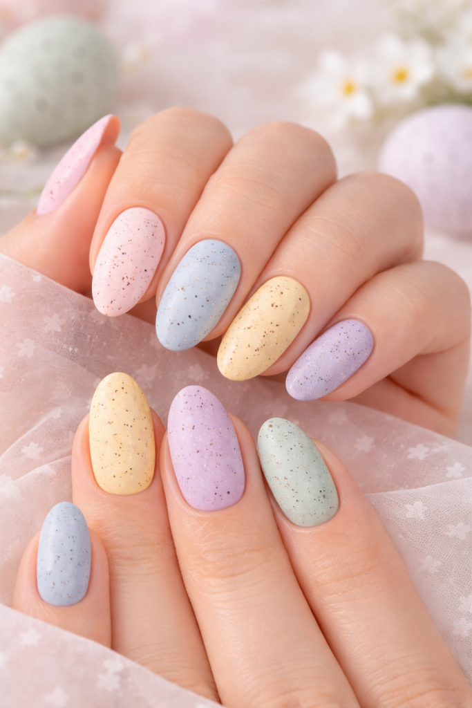 Inspired by chocolate Easter eggs, speckled nails are a minimalist yet trendy option this season. A soft pastel base topped with tiny black or brown speckles creates a chic, egg-like appearance that’s both subtle and stylish. This design is perfect if you want something festive without being overly bold. It pairs well with casual outfits and suits all nail shapes. The beauty of this style lies in its simplicity and elegance, making it a favorite among lovers of minimal nail art. Add a matte top coat for a more realistic eggshell effect or keep it glossy for a polished finish. These Easter egg nails are highly shareable and ideal for social media trends.
