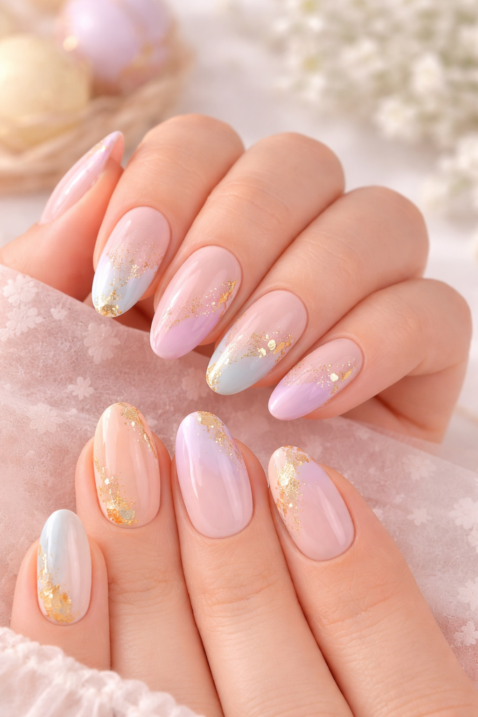 For a more sophisticated look, gold foil nails are a stunning option. Pair soft pastel shades with delicate gold leaf accents to create a luxurious and elegant manicure. This design is perfect for those who prefer subtle glamour over playful art. The gold details catch the light beautifully, adding depth and texture to your nails. These classy manicure ideas work well for formal events, dinners, or stylish gatherings. They’re also trending on Pinterest for their chic and modern appeal. If you want to elevate your Easter nail trends, this design is a perfect choice.
