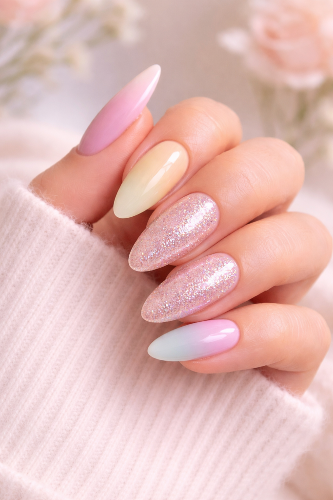 Add some sparkle to your look with glitter nails that shine beautifully under the light. A pastel base with one or two glitter accent nails creates a balanced and glamorous effect. This design is perfect for parties and celebrations, adding a festive touch to your style. You can experiment with different glitter shades like gold, silver, or holographic. These glam nails are eye-catching and perfect for social media photos. If you love bold and shiny styles, this Easter manicure idea is a great choice.