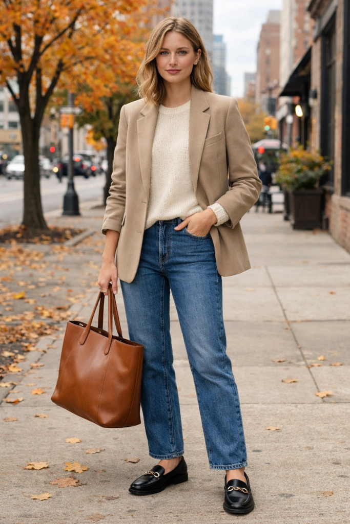 Preppy fall fashion never truly goes out of style, but modern updates make it feel fresh and wearable for today. One of the most timeless combinations is a tailored blazer layered over a lightweight knit. This season, opt for relaxed tailoring instead of stiff silhouettes, pairing neutral blazers with straight-leg jeans or pleated trousers. Soft textures, muted autumn tones, and clean lines keep the look elegant without feeling dated. This outfit works perfectly for casual office days, brunch, or city strolls, proving that classic preppy staples can still feel current with just a few thoughtful styling changes.