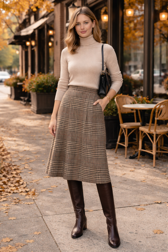 Plaid is a signature preppy print, but modern styling keeps it from feeling overly traditional. Instead of full plaid suits, try a single statement piece like a plaid skirt or trousers paired with a minimalist top. A fitted turtleneck or fine knit balances the pattern while sleek boots add a contemporary edge. Neutral accessories keep the look grounded and wearable. This approach honors classic preppy roots while embracing modern simplicity, making plaid an easy and stylish choice for fall outings and casual workwear
