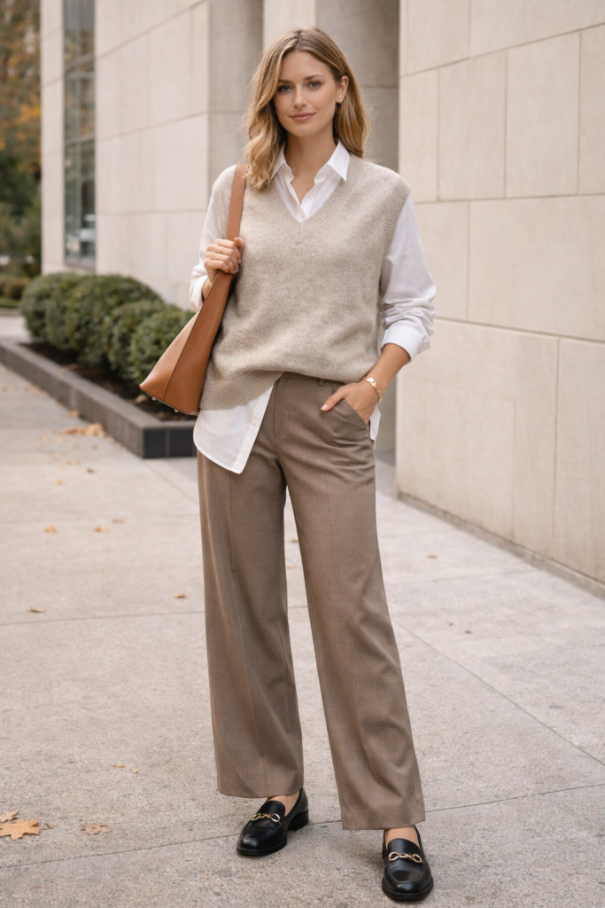Layering is essential for fall, and preppy style does it best with vests and lightweight coats. A tailored sweater vest worn over a long-sleeve shirt instantly adds structure and sophistication. For a modern twist, choose neutral or muted tones and pair the look with wide-leg trousers or relaxed denim. Clean sneakers or loafers keep the outfit youthful and practical. This layered look feels intentional without being overly styled, making it ideal for everyday wear while still maintaining a refined preppy aesthetic.