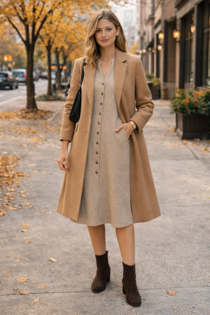 Preppy dresses shine in fall when styled with contemporary elements. A simple A-line or knit dress becomes modern when paired with structured outerwear and sleek boots. Choose solid colors like navy, burgundy, or forest green for a timeless feel. Adding a belt or crossbody bag keeps the outfit polished while maintaining comfort. This look effortlessly blends classic femininity with modern practicality, making it perfect for workdays, casual meetings, or seasonal events where you want to look refined but relaxed.